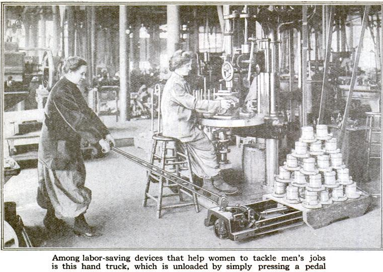 Ilustrată dintr-un almanah din 1918, cu primele transpalete manuale. Acestea erau folosite de femei în fabricile rămase fără forța de muncă a bărbaților, plecați pe front.